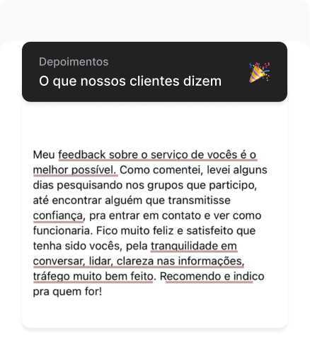 Proximidade, organização, profissionalismo, transparência e segurança. Esses são os valores mais elogiados do nosso trabalho.